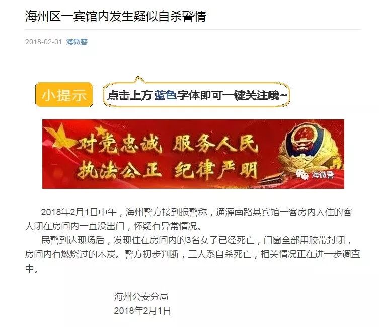 調查:民警到達現場后,發現門窗全部用膠帶封閉,房間內有燃燒過的木炭。警方初步判斷,三人系自殺身亡,相關情況正在進一步調查中。